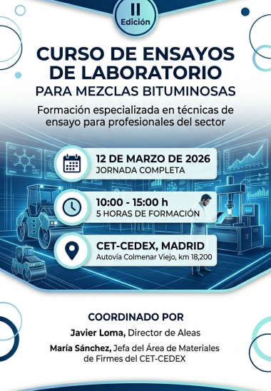 Nos complace anunciar el II Curso de Ensayos de Laboratorio para Mezclas Bituminosas, organizado por Asefma y Aleas con la colaboración del CEDEX, que se impartirá el día 12 de marzo de 2026 en el Centro de Estudios del Transporte del CEDEX, Autovía de Colmenar Viejo, km. 18,200 Madrid, y cuyo programa adjuntamos.